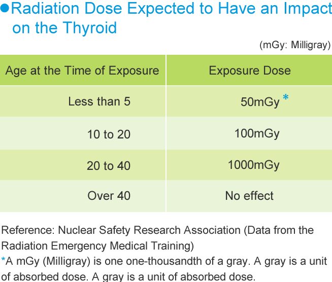 The effects of radiation on the thyroid in children was investigated in detail with respect to the children involved in the Chernobyl nuclear accident in the Ukraine. The main material expelled as a result of the nuclear accident was radioactive iodine. Almost all iodine taken into the body travels to the thyroid. The investigative results showed a high dependency on age. It was evident that particular caution was necessary with children under the age of 5.
