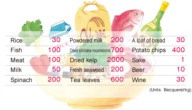 Japanese people are exposed to approximately 1 mSv per year from radioactive substances contained in foods eaten on daily basis. In addition, in Japan, people are exposed to approximately 1 mSv per year from space and the earth, so their exposure from the natural world totals approximately 2 mSv. Note that the becquerel is a unit indicating how much radiation is emitted from an object. The sievert is a unit used when thinking about the effects of radiation.