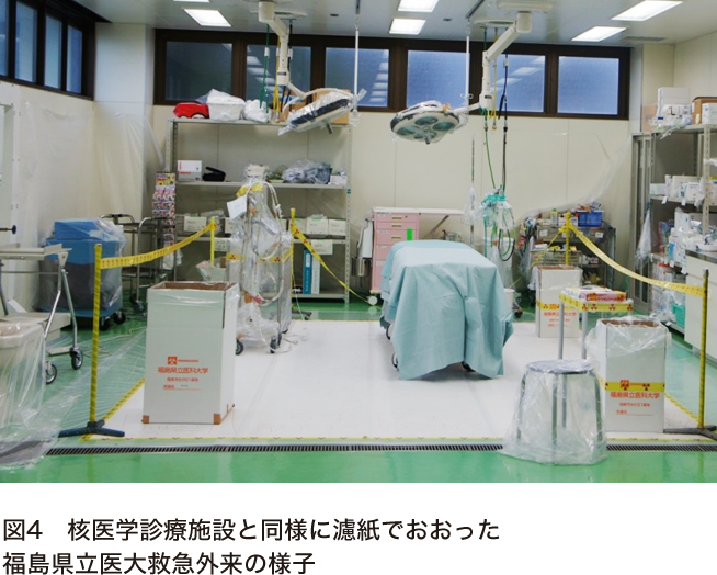 医療人が第一に行わなければならないことは、治療の必要がある人への適切な対応です。しかし、次の患者さんに放射性物が付着しないように、プラスチック濾紙やビニールで診察台や処置のための無影灯など患者さんが触れる物品を覆ってください。これは核医学施設用として市販されています。