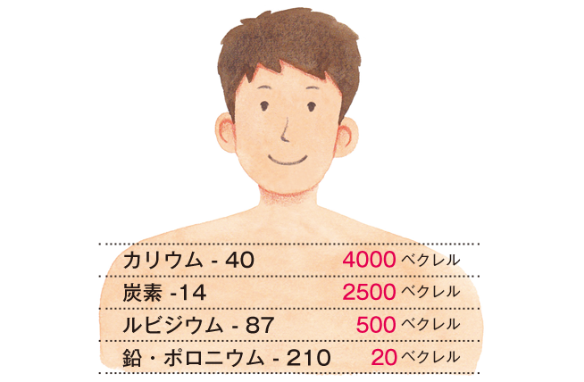 自然放射線(人体) 体内には常に放射性物質が存在する 体内にはカリウム、炭素などの図に示すような放射性物質が含まれます。体重60kgだと体内の放射性物質は7,000ベクレル程度になります。体重が重いほど放射性物質は増えます。